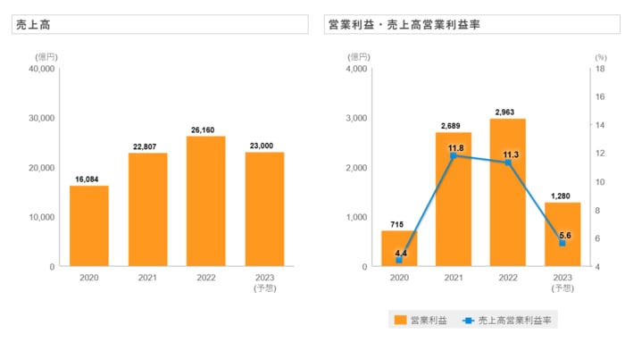 次に、日本郵船の業績データを確認していきます。日本郵船のホームページによると、2020年度~2022年度の売上高、営業利益・売上高営業利益率と2023年度の予想は、以下のように推移しています。