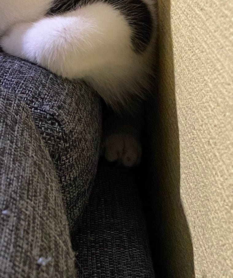 Twitterで注目を浴びているのはハチワレ猫の「モズク」ちゃん。マイペースな性格の女の子です。この日のモズクちゃんはソファの背もたれに座ってくつろいでいました。壁と背もたれをうまく使って、身体をおさめているように見えますが……?
