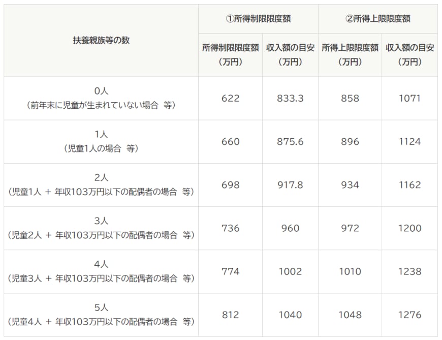支給額が減額となったり停止されたりする年収や所得の水準は、扶養する家族が多いほど高くなります。子ども4人と妻を扶養する夫は、夫の年収が約1040万8000円を超えると、児童手当の支給額は月5000円に減額となります。また、支給が停止される年収の水準は約1276万円です。