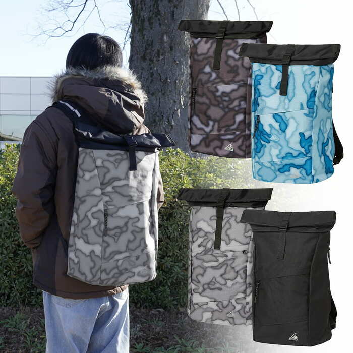 防水素材のリュック。リュック上部の開閉口からの収納スペースは、水が中に入りにくい仕様。さらに外側に縫い目がなく、水や泥汚れが入りにくいです。コップを取り付けられるループや反射材付きなので、アウトドア用のリュックとしても活躍します。