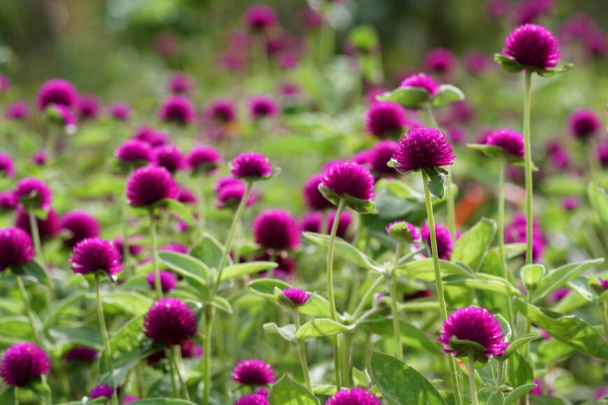 センニチコウは、キレイに色づいた苞を楽しむ植物。コロンとした丸いフォルムの苞はとても愛らしく、庭や花壇にナチュラルな印象を与えてくれます。濃い紫や白、パステルカラーなど複数のカラーがあり、さまざまな色をミックスして植えるのもオススメ。