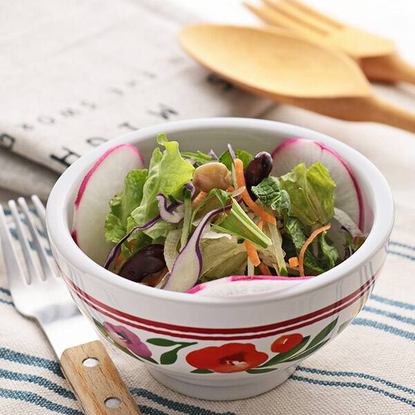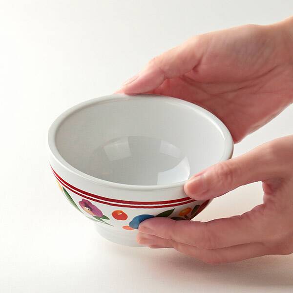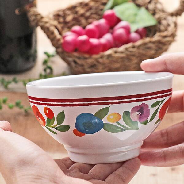 花柄をあしらったオリジナルデザインの陶器製のボウル。サラダやスープボウルなど様々に料理に使える便利なサイズ。サイズは、(約)110(口径)×60(高さ)mmとなり、容量は、約260~300mlとなっています。