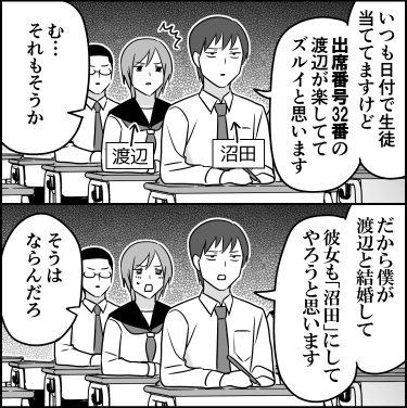 いつも日付で生徒を当てている教師に対して、出席番号22番の沼田が不平等だと指摘。これだと、日付にない32番の女子・渡辺は絶対に当てられることがないからです。