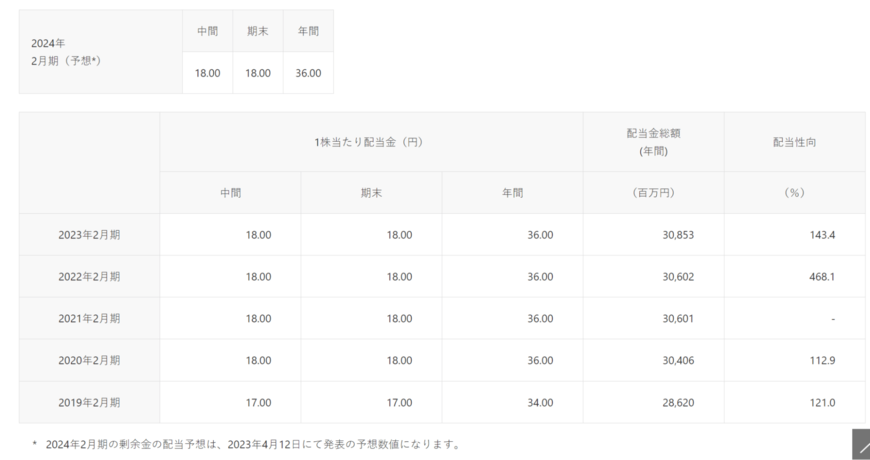 イオンの年間配当は、2020年2月期から数えて4年連続で1株あたり36円です。
