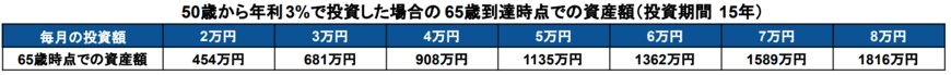 50歳から毎月同額をつみたて投資した場合の、65歳到達時点における資産評価額は以下のとおりです。なお、年利3%での運用を前提とします。