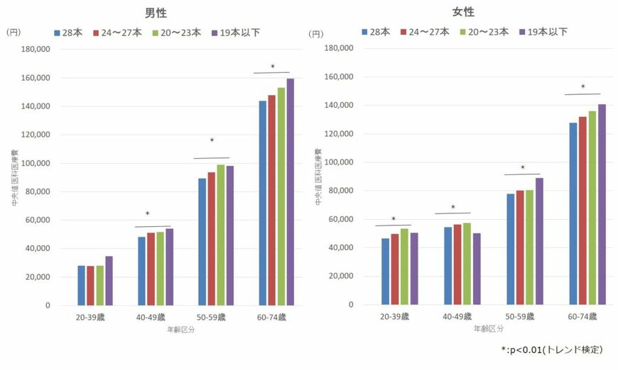 多くのオーラルケア製品を展開しているサンスターグループが20歳~74歳の労働者約25万人の定期健康診断結果と医療機関の診療情報をもとに実施した分析によると、歯の残存数が少ない人ほど医科医療費が増加する傾向が確認できたそうです。特に60歳以上で顕著で、28本の人と19本以下の人とでは約2万円の差がありました(中央値)。