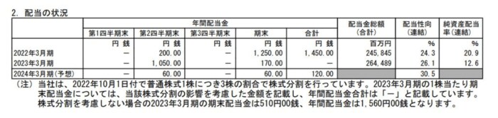 日本郵船の株式を1年前に買い、持ち続けたとすると、「2023年3月期の中間配当」と、「2023年3月期の期末配当」の計2回を受け取ることができます。