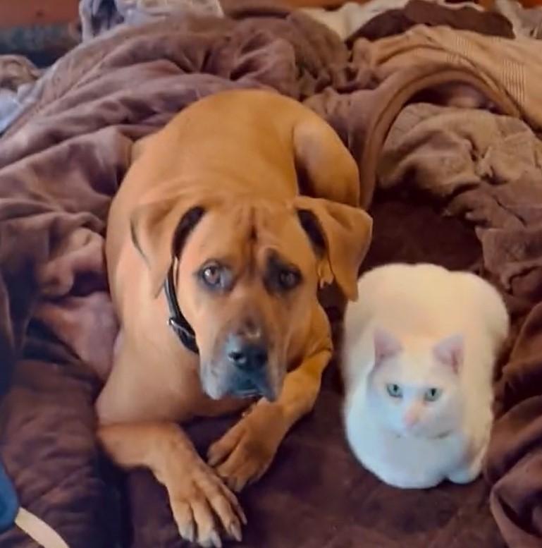 飼い主さんがお部屋に向かうと……?土佐犬さんと白猫さんが仲良く過ごすようすがTwitterで注目を集めています。
