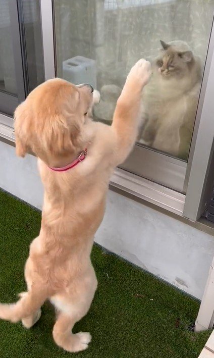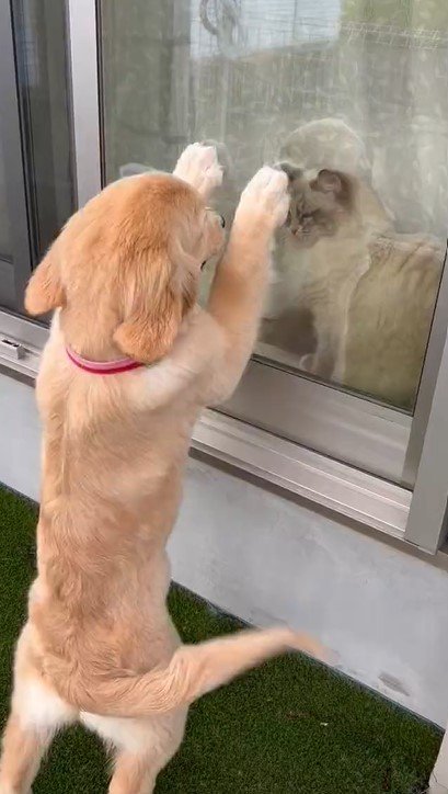 「窓越しでも遊びたくて仕方ない」犬と猫の微笑ましいワンシーンが話題