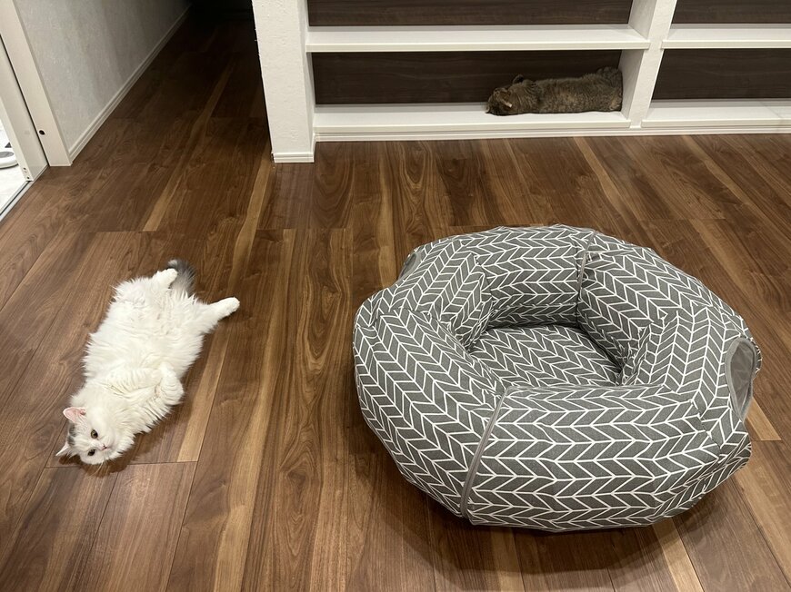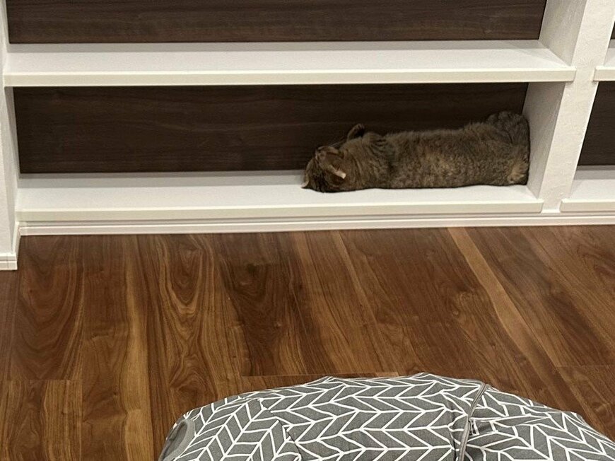 お部屋でくつろぐ2匹の猫ちゃん達。棚の壁面と一体化するようにくつろぐ兄猫さんの姿がTwitterで注目を集めています。