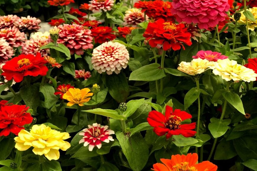 ジニアは夏花壇の定番花。別名「百日草」とも呼ばれるほど、長期間に渡って次々と花を咲かせ続けます。さまざまな花色が揃っていることに加え、一重咲きや八重咲き、ダリア咲きやポンポン咲き、さらに草丈が低いタイプや大きく育つものなど品種が豊富。