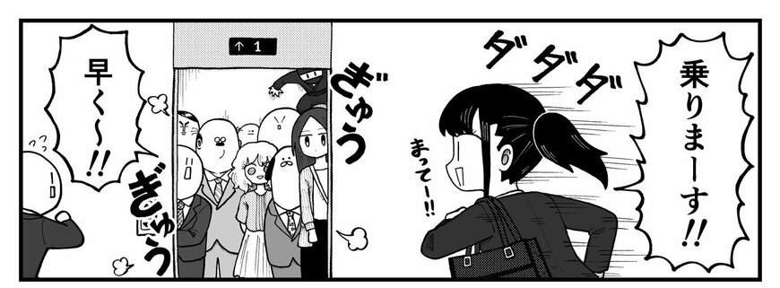 「重量オーバー」というコメントとともに投稿されたのは、ぎゅうぎゅうのエレベーターに駆け込もうとする新卒ちゃんの様子を描いた4コマ漫画でした。