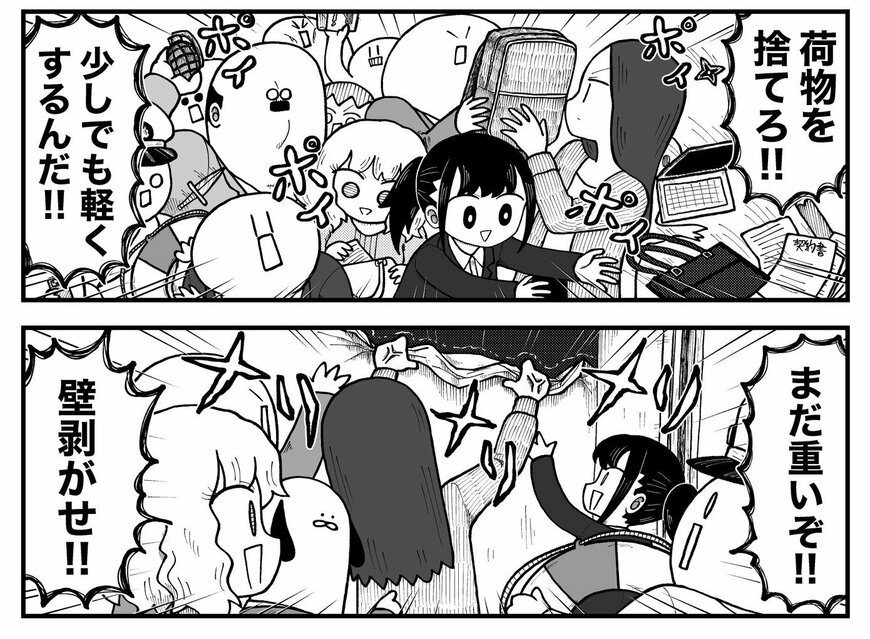 なぜかエレベーター乗員全員で持ち合わせの荷物を捨てて、身辺を軽くしようとする一同。エスカレートした人たちは最終的にエレベーターの壁まで剝がし始める始末です。
