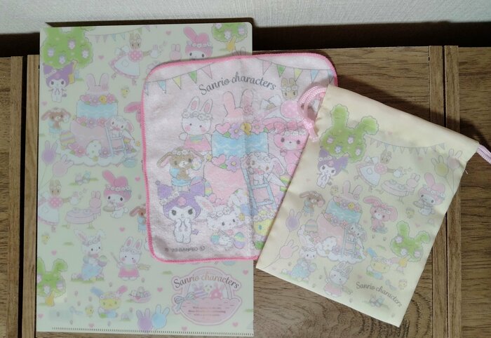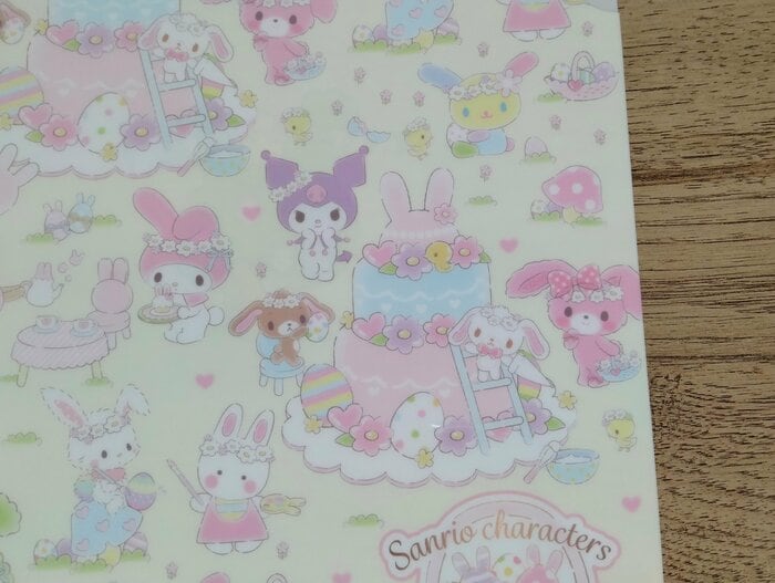 表面は、サンリオのうさぎキャラクターたちがイースターエッグやケーキを作っているデザインとなっています。にぎやかでかわいらしいデザインのアイテムです。