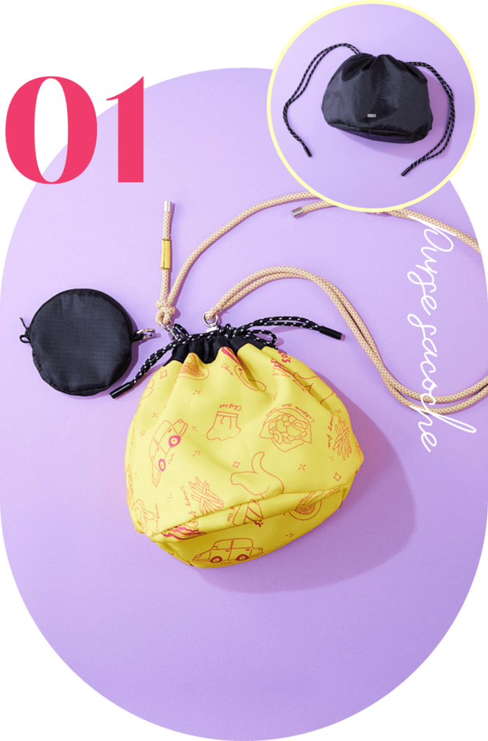- サイズ:(巾着)直径約20cm×約20cm、(ロープ)約150cm-85cm、(ミニポーチ)直径約11cm、厚さ約1.5cm