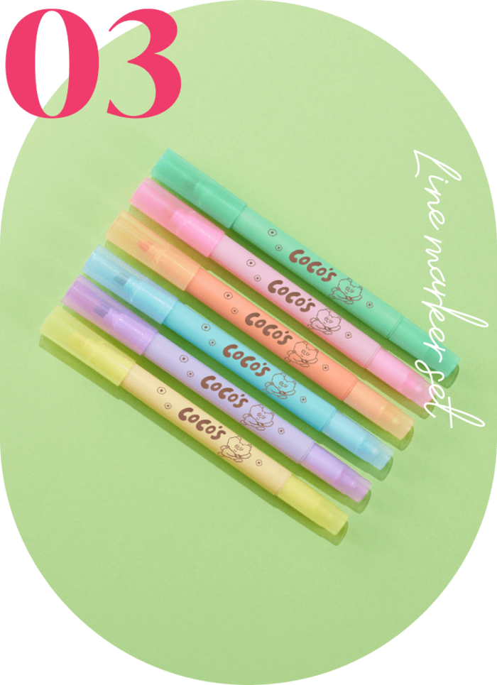 ダブルヘッドのやさしいカラーの6色ペンには、ココスの様々なところで活躍中のココッス君が登場しました。