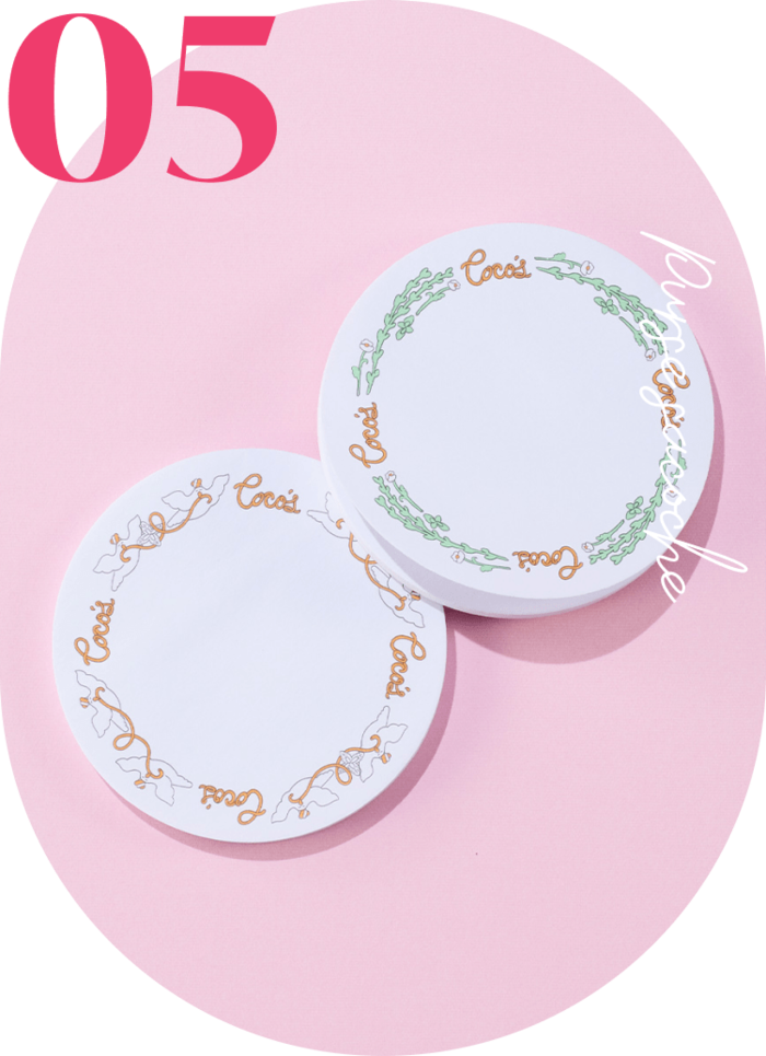 ココスのパスタ皿と同じデザインの丸い付箋です。文字をパスタで表現したハトのコックさんとハーブ&お花の2種類の柄が楽しめます。