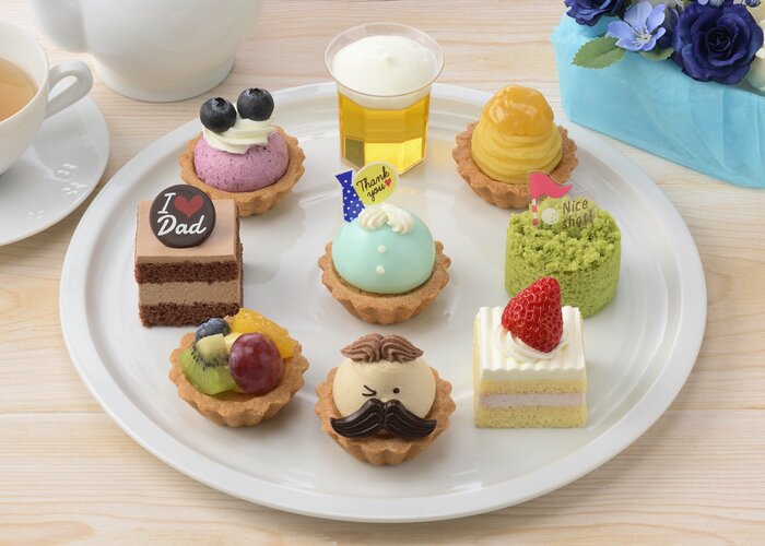 「父の日セレクション(9個入)」は、ゴルフにビールといったお父さんの好きなものをデザインしたプチケーキの詰め合わせです。お父さんをモチーフにしたケーキや、彩りのよい季節のフルーツを使ったケーキがそろいました。9個それぞれ個性的なデザインや味わいが楽しめるので、家族みんなで盛り上がれそうです。