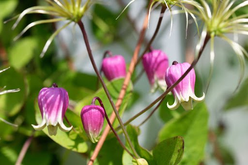 クレマチスにはさまざまな品種がありますが、アジサイと一緒に飾るならヴィオルナ系クレマチスがオススメ。ヴィオルナ系にはふっくらしたフォルムの壺型と、呼び鈴の形をしたベル型があり、それぞれに赤紫色や青、白や複色などのカラーが揃っています。