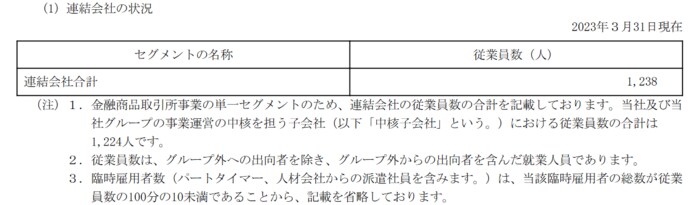 日本取引所グループ(提出会社)の2023年3月31日現在での従業員数、平均年齢、平均勤続年数および平均年間給与は以下の通りです。