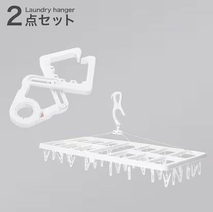 「部屋干しクロスフック(ホワイト)」と「折りたたみ角ハンガー40ピンチ(フォルトゥナ)」が1点ずつセットになった商品です。