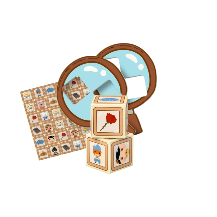 「虫メガネパーツ」「キューブ」「ゲームボード」がセットになっており、絵探しの競争ゲームです。