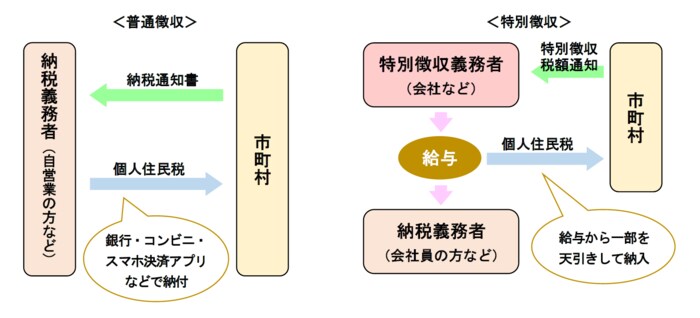 住民税の納め方には「普通徴収」と「特別徴収」の2つがあり、普通徴収は、個人事業主や年金受給者などが対象になります。自治体から送付された6月・8月・10月・1月の年4回に分けた納付書を、銀行やコンビニなどに持参して払込みます。