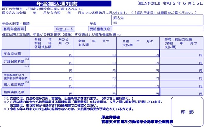 - 日本年金機構「年金額改定通知書と年金振込通知書(一体となったもの)」