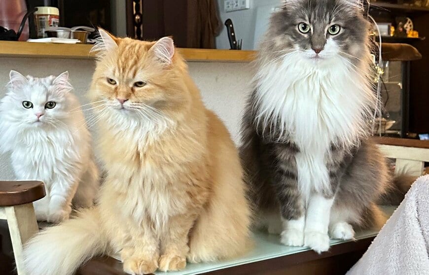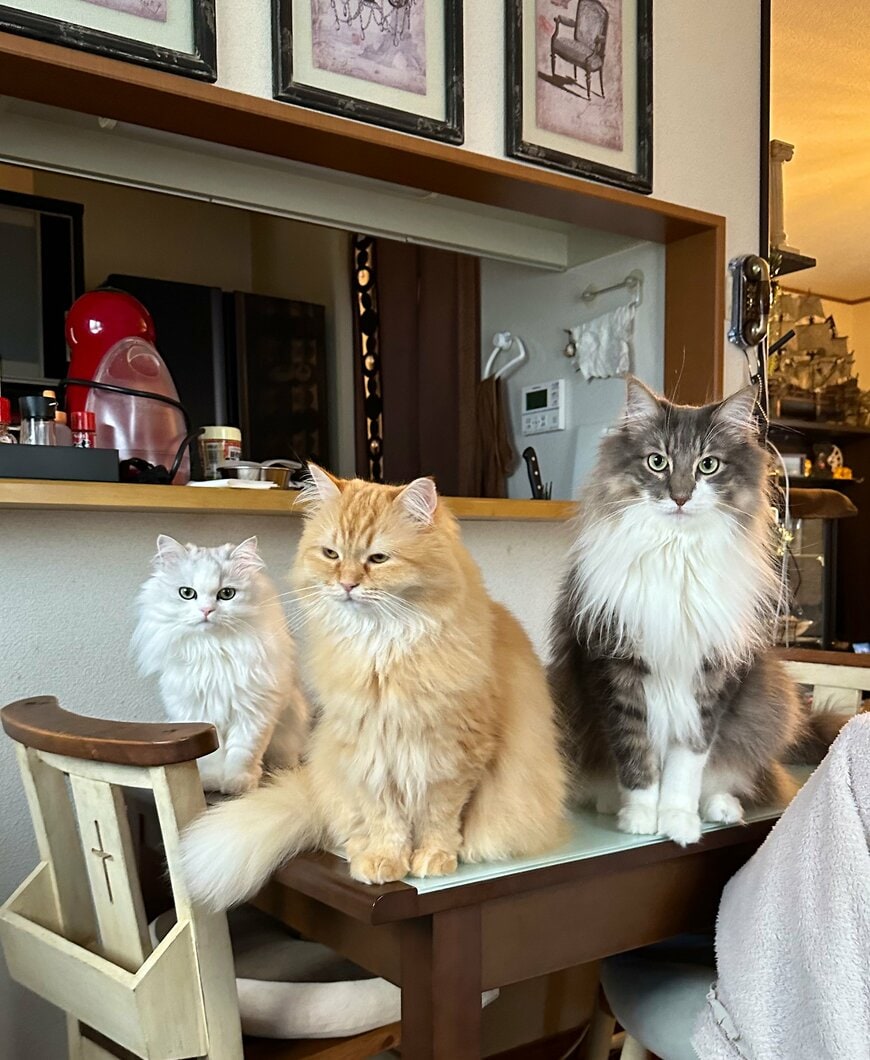 3匹の表情から伝わる「圧」に加え、みんな揃ってお行儀よく同じ格好をしているところも可愛くて、思わずクスッときてしまいます。