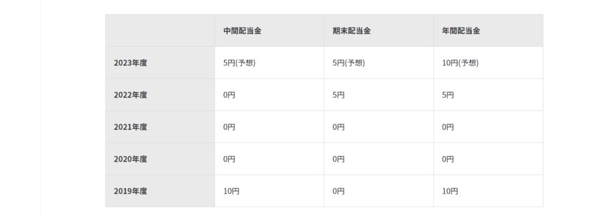 2023年度は業績回復にともない復配を進める想定で、中間・期末それぞれ5円ずつ、年間10円の配当予想としています。