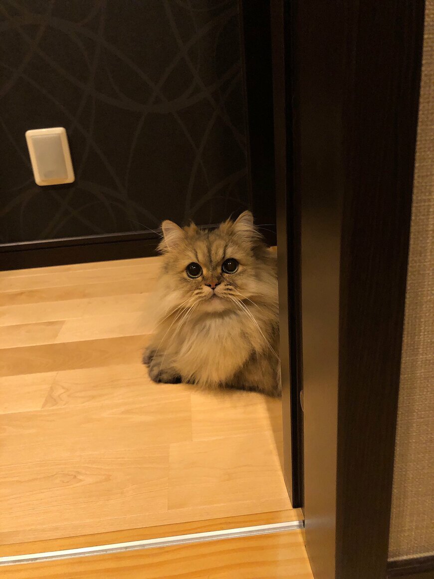 この日のパピコくんは、家事をする飼い主さんをジッと待っていた様子。ドアからひょっこりと覗くように飼い主さんを見つめています。