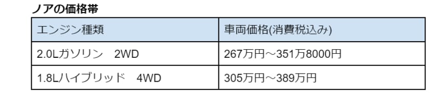 しかし2.4L車は400万円を切るエントリーグレードがあり、ノア/ヴォクシーの上位グレードと同等かそれより安い価格になっています。