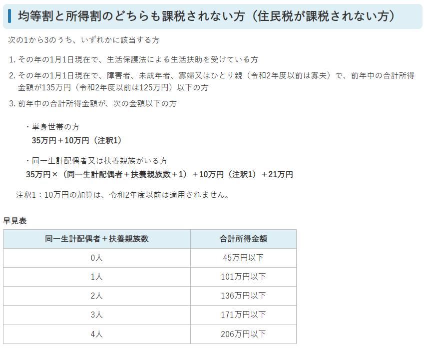 ただし上記の1もしくは2に該当しても、住民税が課税される人の扶養親族からなる世帯や、租税条約により住民税免除を受ける世帯は除きます。