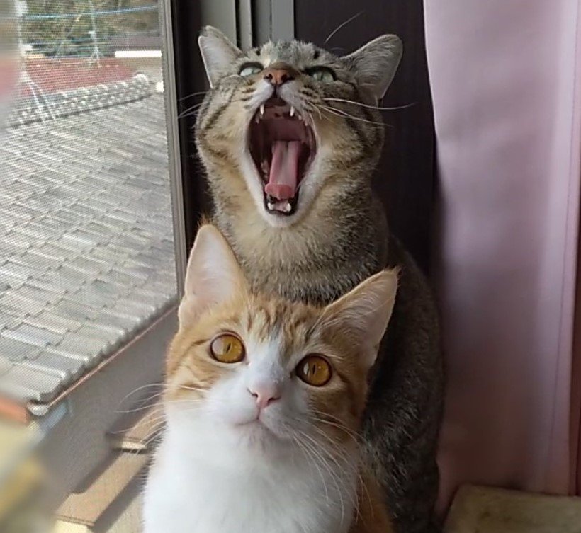 SNSで反響を呼んでいる、凛と佇む妹猫ちゃんの後ろで大あくびをする兄猫さんの、平和があふれるワンシーンをご紹介しました。