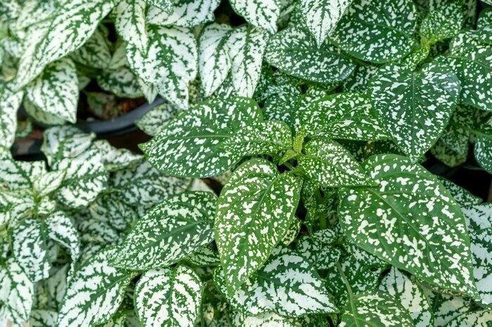 独特の模様が入る葉がユニークなヒポエステス。ピンクやレッドカラーの葉もオシャレですが、夏はホワイトの斑入り葉が涼やかでオシャレです。