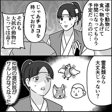 そう指摘するおばあさん。もしもチョコを持って行ってしまったら、仲間の代表格である犬、キジ、サルのうち、サルしか残らないことに…。かなり寂しい桃太郎一行となってしまい、鬼ヶ島に辿り着く前に士気が下がってしまいそうですね。