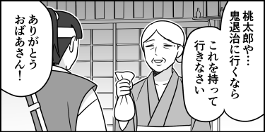 桃太郎と言えばきびだんごが有名ですが、今回おばあさんは趣向を変えたものを桃太郎に持たせようとしているようで…。