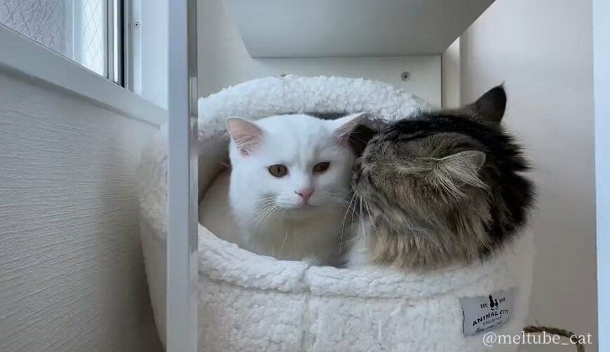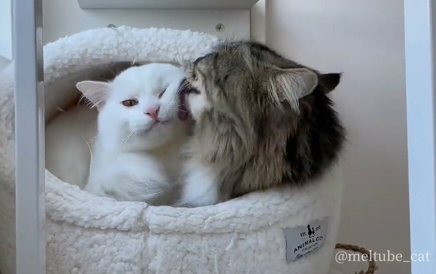 注目を浴びているのは2匹の猫ちゃん。白猫の「マオ」くんとキジ猫の「メル」くんです。元保護猫のマオくんにとって、先住猫のメルくんはお兄ちゃんのような存在。仲良し猫ちゃんたちの愛があふれるワンシーンが話題となりました。