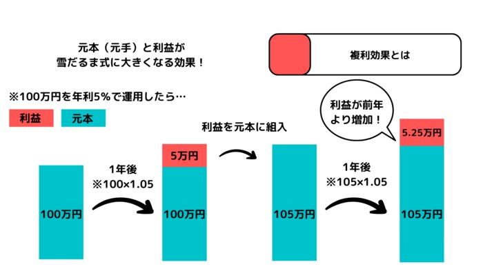 投資は長期で行うことにより、複利効果を得られるというメリットがあります。複利効果とは、運用で得た利益を元本部分に組み入れて再投資することで、資産の増え幅が大きくなることをいい、運用期間が長いほどその効果も大きくなります。