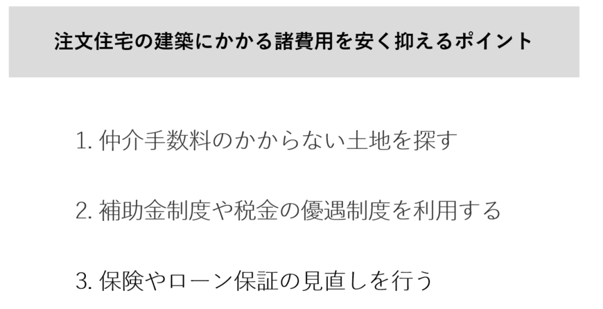 注文住宅を建てる際に諸費用を少しでも安く抑えるためには、次の3つのポイントを知っておく必要があります。