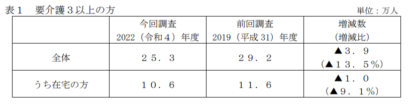 厚生労働省の調査によると、特養の待機者は、2022年4月時点で約25万3000人(※)です。前回2019年の調査が約29万2000人であったため、待機者数は減少傾向にあります。