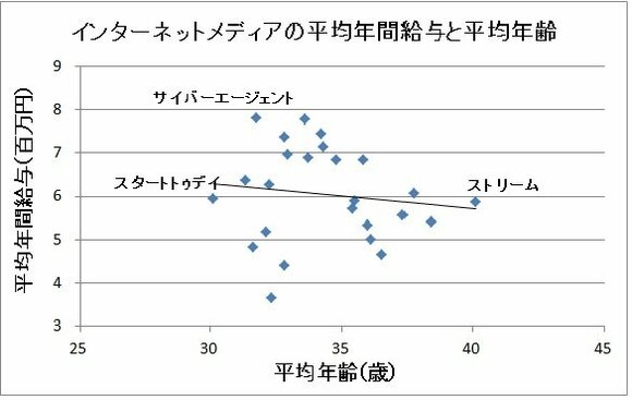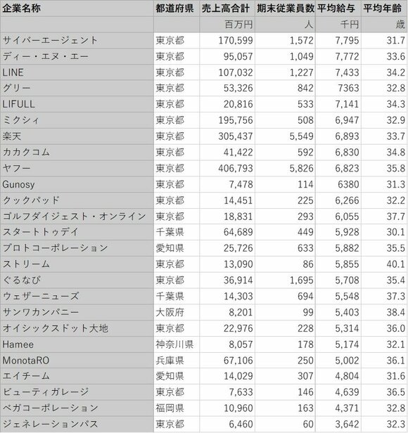 今回ピックアップしたのは、日本のインターネットメディアのうち売上高の大きい25社。非上場であり決算資料が非公開の企業については、対象外としています。25社の単純平均による平均年齢は34.0歳で、平均年収は604万円となっています。