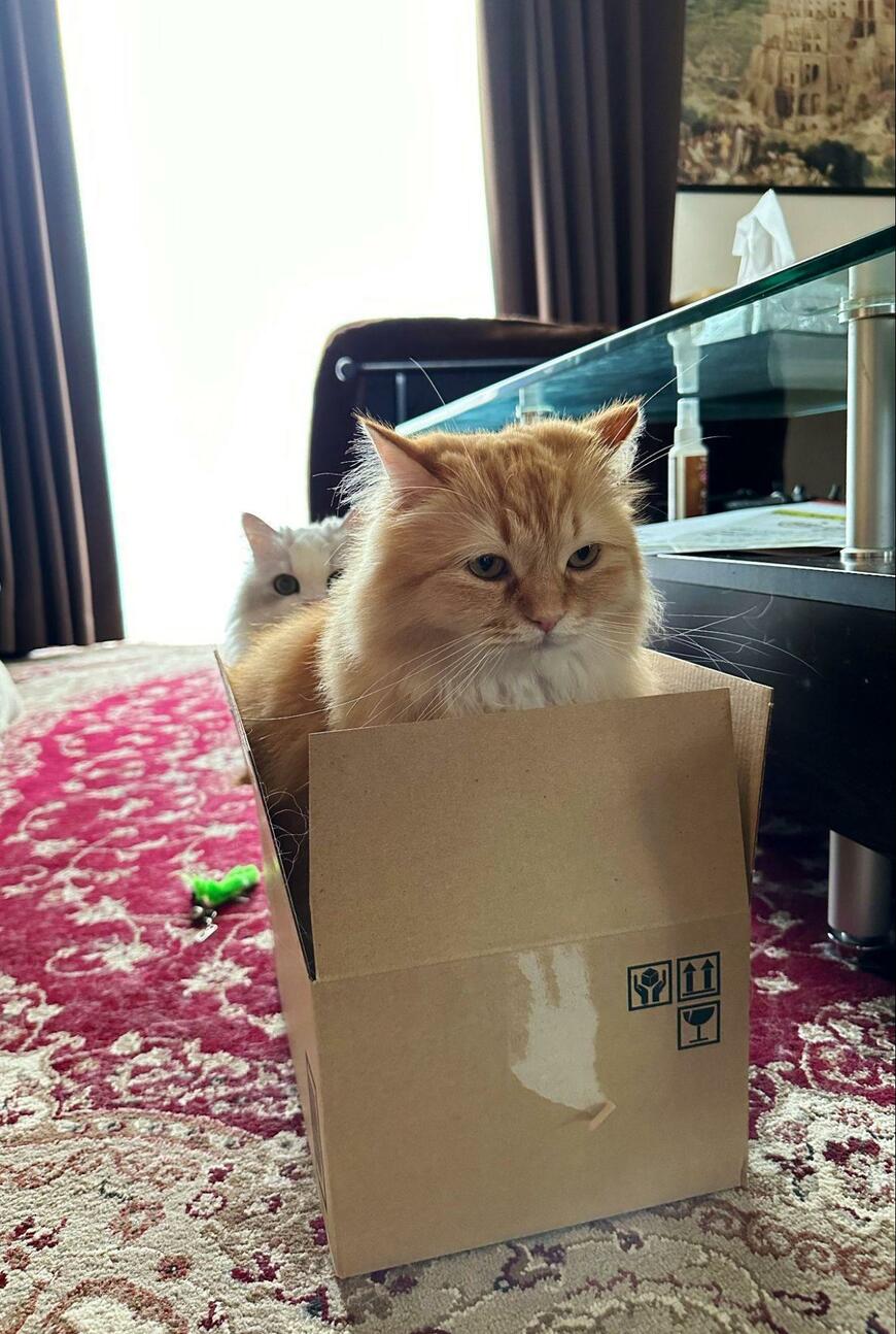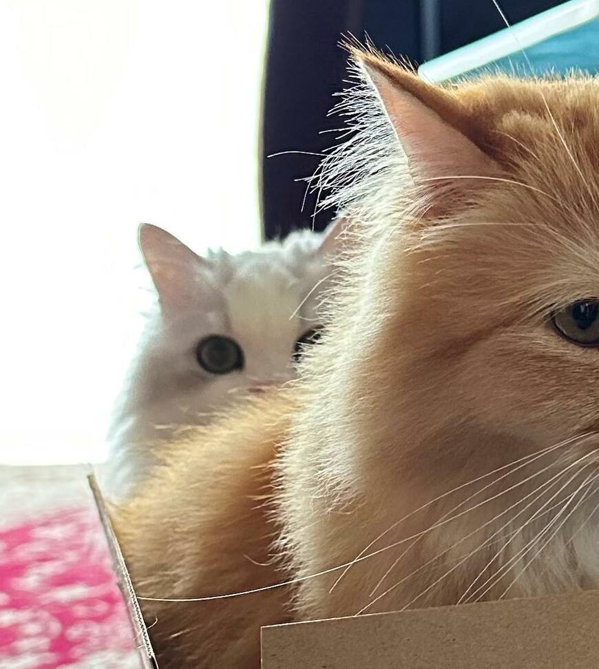 投稿された写真に写っているのは2匹の猫ちゃん。段ボールに入った「エマ」ちゃんは、目を細めてうつむき、一点を見つめていました。そしてその後ろには「ノーマン」くんが、段ボールに入る順番を待つようにして座り込んでいます。