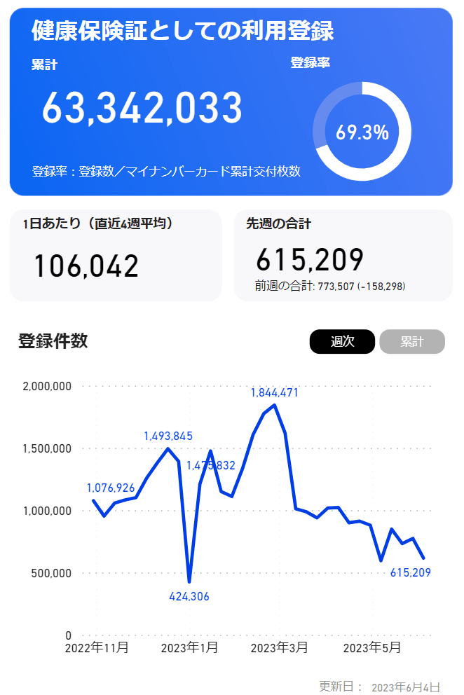 健康保険証の累計登録件数は6334万2033件。登録率は69.3%。1日あたりの申請件数は10万6042件(直近4週平均)。先週の申請合計件数は61万5209件で、前週から15万8298件減でした。