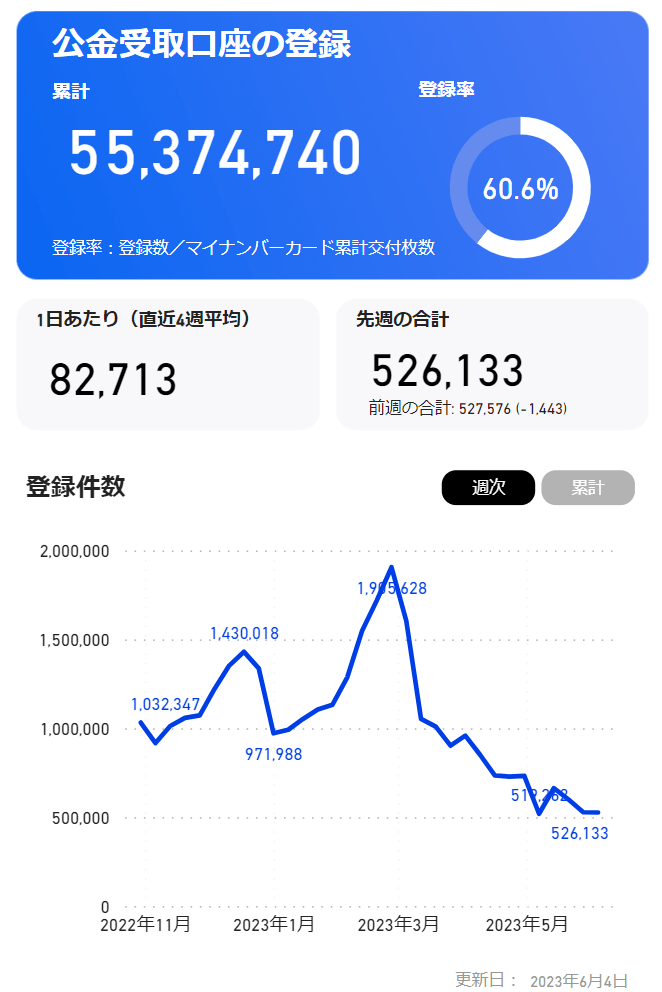 公金受取口座の累計登録件数は5537万4740件。登録率は60.6%。1日あたりの申請件数は8万2713件(直近4週平均)。先週の申請合計件数は52万6133件で、前週から1443件減でした。