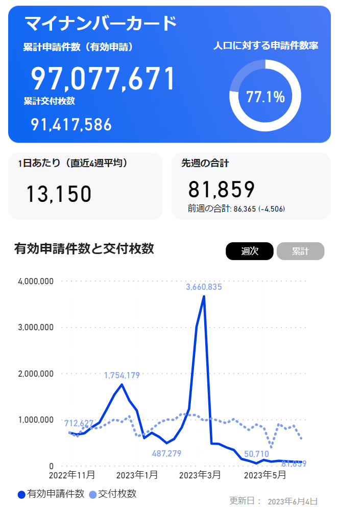 デジタル庁が2023年6月4日に発表した政策ダッシュボードによると、マイナンバーカードの累計申請件数(有効申請)は9707万7671件、累計交付数は9141万7586件。人口に対する申請件数率は77.1%。1日あたりの申請件数は1万3150件(直近4週平均)。先週の申請合計件数は8万1859件で、前週から4506件減でした。