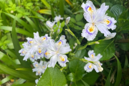 アヤメに似た白い花が咲くと、日陰に灯りがともったように見えるシャガ。日本の里山などでもよく見かけます。白い花に入る黄色と紫の模様が鮮やかです。
