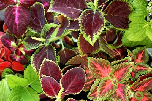 コリウスは緑のほかに黄色や赤、紫などカラフルな葉色がそろっている一年草。日なたでも育ちますが、日陰のほうが葉も鮮やかに色付きます。