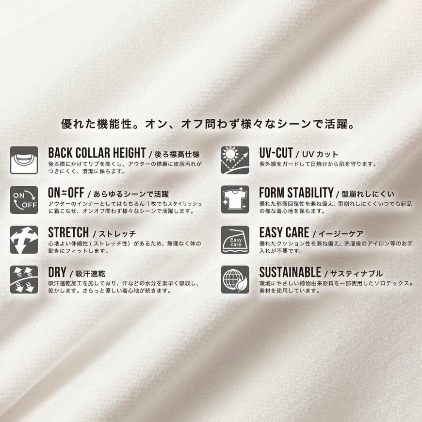 UVカット機能を備えたスタイリッシュなTシャツ。アウターの襟裏に皮脂汚れが付きにくいように、後ろ襟にかけてリブを高く仕上げています。
