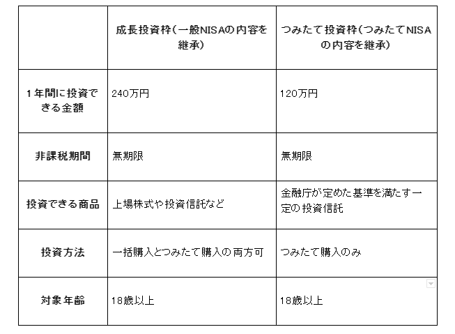 新NISAは一般NISAの内容を継承した「成長投資枠」と、つみたてNISAを継承した「つみたて投資枠」の2本立てとなります。